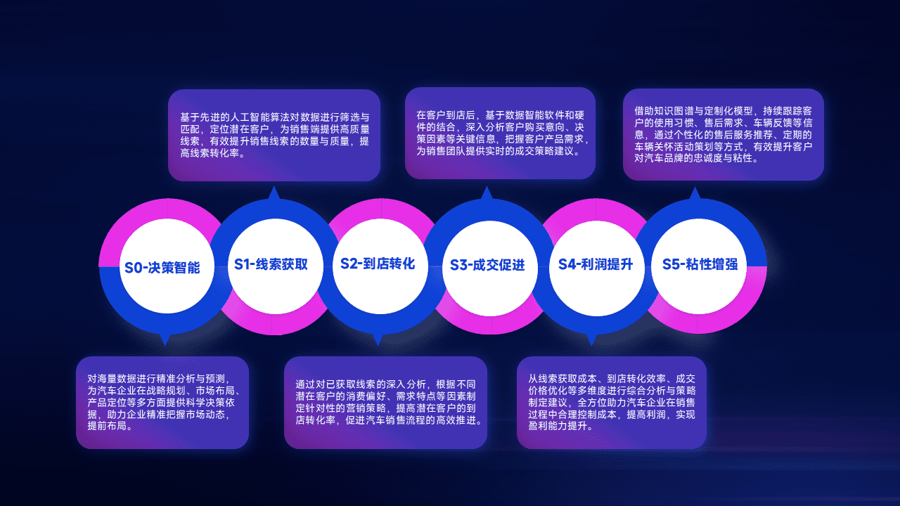 通过拓宽潜在客户来源、、优化线索分配并提高到店转化率,,,以增强销售效率。。。。同时,,,利用线索数据不断优化分析模型,,,有效提升转化率,,,扩大营销影响力。。。。